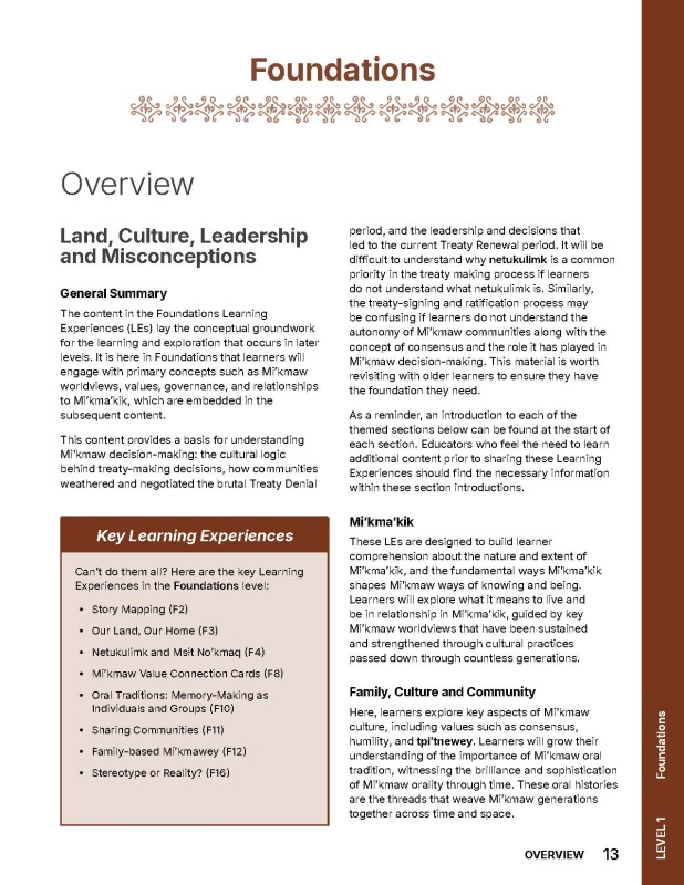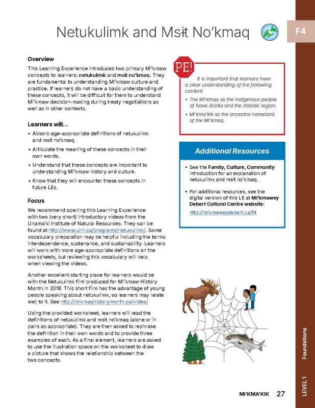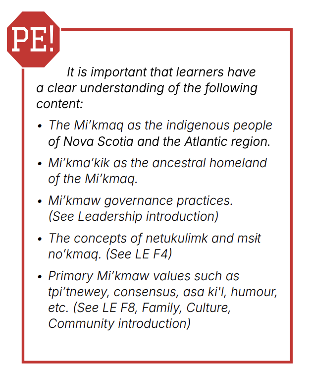 The Pe! blocks in each learning experience highlight the content required for the learning experience and notes where teachers and learners can gain content required for success. (Pe! means wait! Or hang on! in Mi’kmaw.)