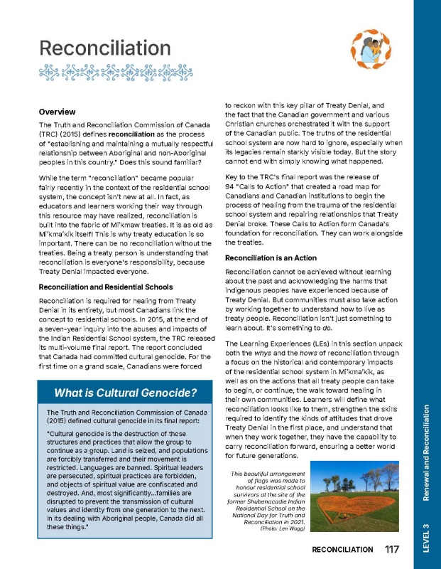During the creation of this resource, many lengthy discussions were held about how to connect it to curriculum outcomes. Because the curriculum was undergoing a revision at the time, the decision was made not to link content to specific outcomes. Despite this, the authors, in partnership with educators, and Mi’kmaw Elders and knowledge carriers, have worked with general curriculum outcomes as well as age-appropriate strategies to develop Roots of Reconciliation and ensure it will be useful to teachers. This resource is designed to be adapted, scaled and modified as necessary.