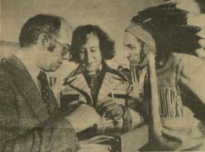 Following Mi’kmaw treaty protocol, the position paper was presented in ceremony. In that ceremony, Kji-Keptin Alexander Denny (middle) and Kji-Saqmaw Donald Marshall Sr. presented Minister of Indian Affairs Warren Allmand with a gift. (Courtesy of Owen Fitzgerald, Micmac News, vol. 6, no. 5, May 1977, p. 1)