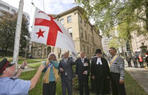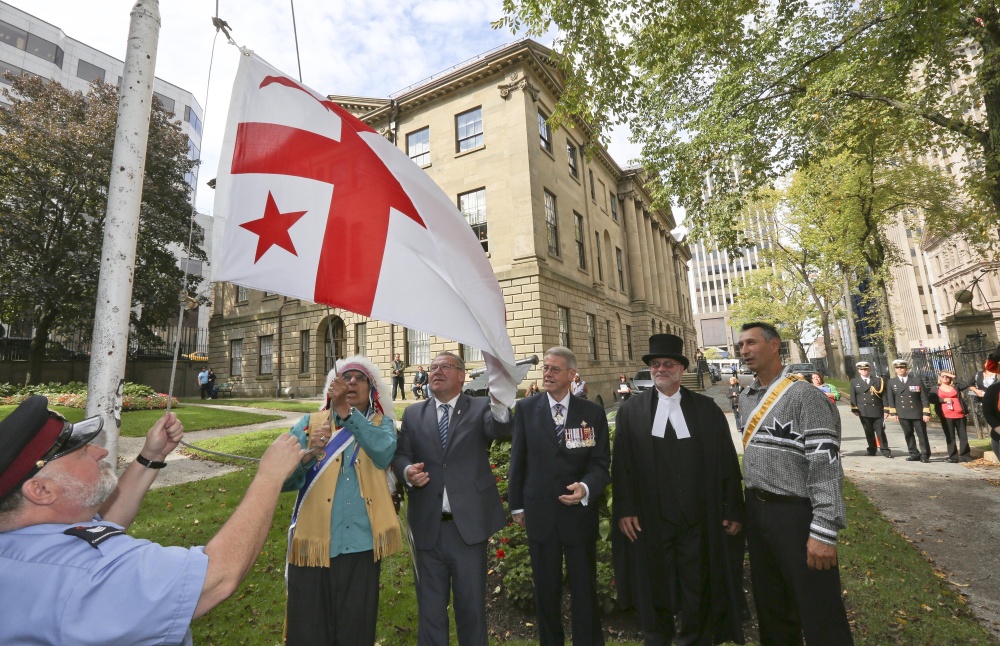 Kji-Saqmaw Ben Sylliboy (second from left) and Kji-Keptin Antle Denny (end right) participate in the flag-raising ceremony on Treaty Day in Halifax, 2012. (Courtesy of Len Wagg, Communications Nova Scotia, October 1, 2012)