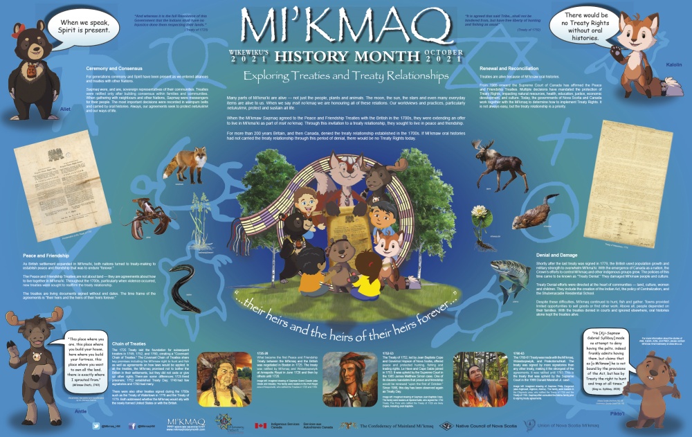 Treaty Day was officially established with the 1752-53 Treaty. The 2021 Mi’kmaq History Month poster is a great resource for exploring this treaty and many others. Educators can also revisit the Treaties level of Roots of Reconciliation to prepare for Treaty Day!